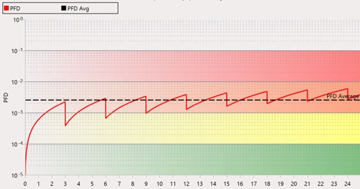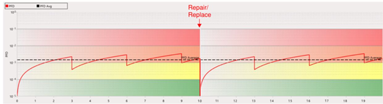 The image below highlights the benefits of reduced mission time to lower PFDavg for a higher achieved SIL. The intent is to bring SIF components to 'as new' condition. For non-repairable equipment, this means replacement; for repairable equipment, it requires rebuilding all wearable components. The remaining components must also be in 'as new' condition. If achieved, the PFD resets to zero, starting a new cycle. This approach can reduce proof test requirements or avoid the need for additional redundant hardware.