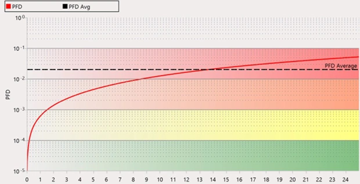 The image above represents equipment probability of failure over time without considering SIF Proof Testing which can reveal hidden failures before they occur, or an established Mission Time which allows the PFDavg to reset to zero. This graph shows that all equipment will eventually fail, and this probability increases over time. The red line represent the probability of failure on demand, while the dashed black line represents an average probability on demand (PFDavg). A lower PFDavg is represents a higher overall reliability.