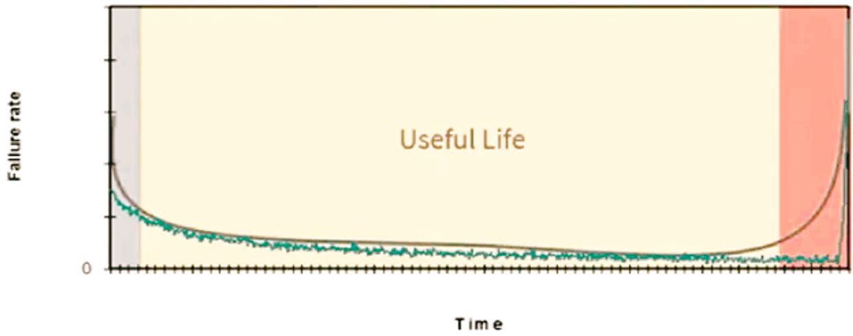 The following image of a bathtub curve is used to illustrate the importance of considering useful life. This graph and others like it below show the calculated failure rates over time for typical equipment.